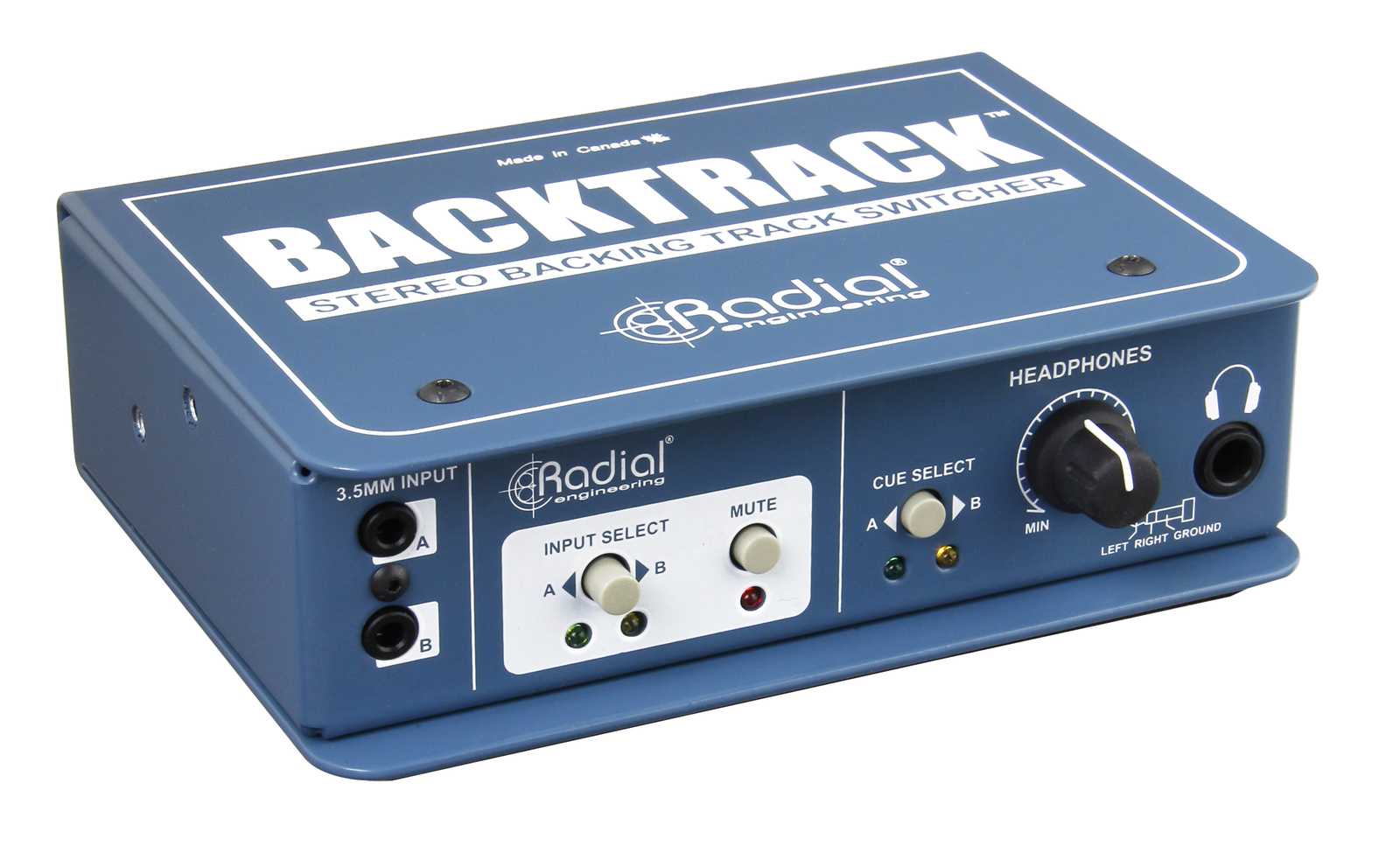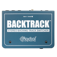 The Backtrack is a compact stereo audio switcher, perfect for bands running redundant backing tracks on stage. Connect both source devices to the Backtrack via ¼" or 3.5mm connectors, and switch between them or mute them altogether using the front panel controls or a JR-2 remote footswitch. A headphone output with level control allows you to check either input at any time, and ¼" monitor outputs feed powered speakers for playback on stage. Dual XLR outputs feed the PA system, and feature a ground lift switch and transformer isolation to prevent buzz and hum from ground loops. The Backtrack lets you easily connect a laptop computer, MP3 player, or recording interface.
