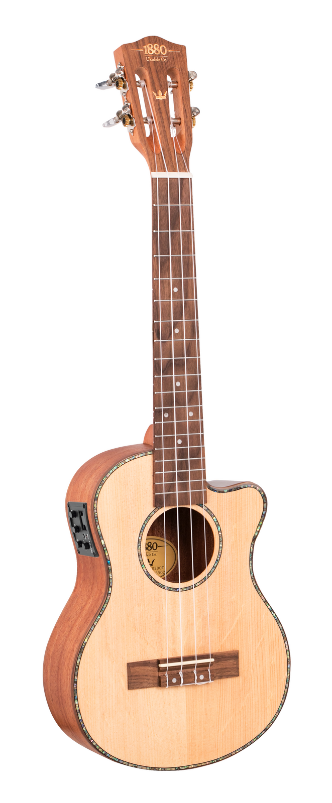 Solid spruce top, mahogany back and sides. Arched back. Black walnut with pearl top binding and black walnut back binding. Okoume neck with black walnut fingerboard and pearloid dot inlays. Pearl inlaid soundhole rosette. Black walnut bridge. Graph Tech Canada, NuBone XB saddle and bone nut. Chrome Waverly style open gear machine heads. Aquila Super Nylgut strings. 18 nickel frets. 1880 pickup and preamp with volume, bass, middle and treble. Built-in chromatic tuner with on/off button and low battery indicator.