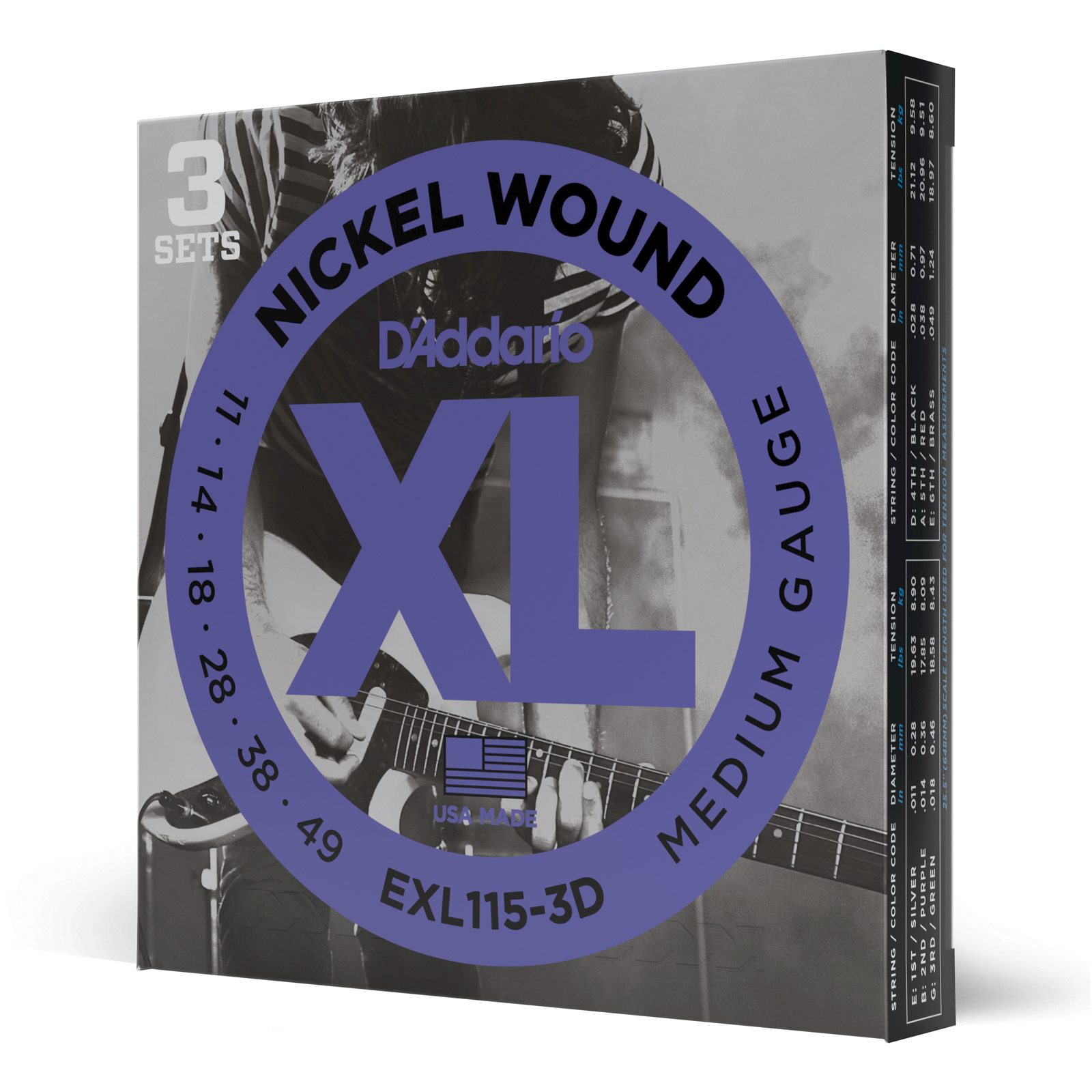 D'Addario EXL115-3D Nickel Wound Electric Guitar Strings, 3 Sets, Medium/Blues-Jazz Rock, 11-49, 3 Sets