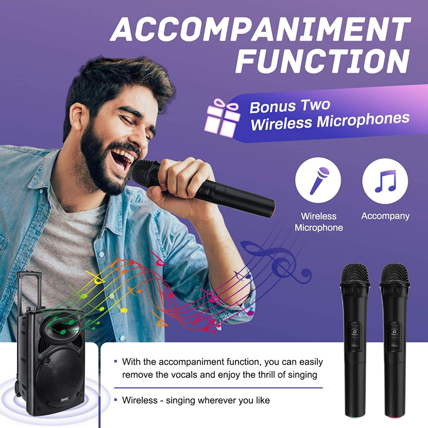 EXTRA CONTROLS This professional karaoke machine is excellent and impressive with 2 bonus wireless microphones, remote control, user manual, and AC and DC cable. Abrato karaoke speakers come with a 90-day warranty!