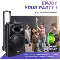 LIGHT and PORTABLE The Portable Karaoke Machine weighs just 9Klgs with retractable pullout, wheels and handles to allow you to move it easily like a suitcase. It can travel with you; having it in your car doesn’t take too much space, but fill your journey with pleasure of karaoke. Besides the rechargeable battery inside, it also has a DC 12V INPUT socket for additional DC 12V power source (such as power station, car adapter, battery, etc.) to keep the party going on and make sure everyone have a great time.