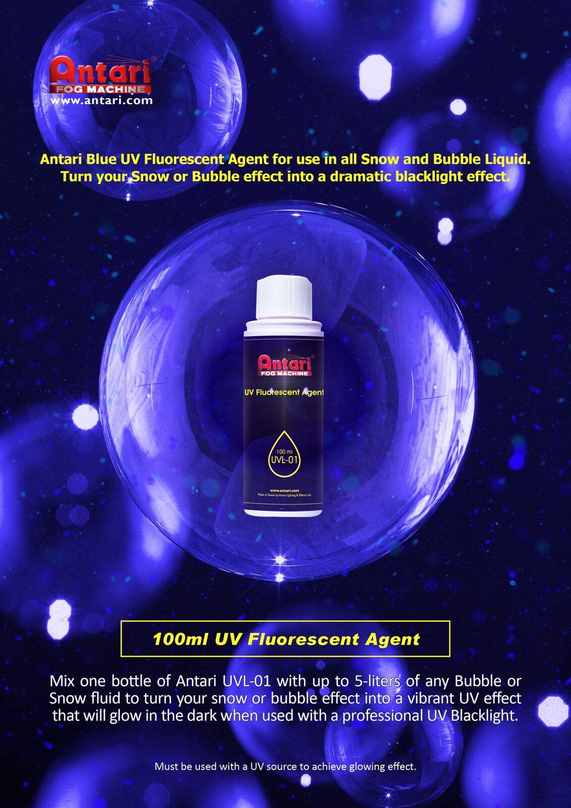 Mix one bottle of Antari UVL01 (100ml) with up to 5 Liters of any Bubble or Snow fluid to turn your snow or bubble effect into a vibrant UV effect that will glow in the dark when used with a professional UV Blacklight. *Must be used with a UV source to achieve the glowing effect.