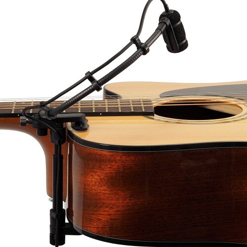 The guitar mount is manufactured with a rugged, thumbscrew adjustable clamp with pads that attaches to guitars and other stringed instruments while leaving fewer marks. You can adjust the clamp length between 90 mm and 135 mm. The ATM350GL Cardioid Condenser Instrument Microphone w/ Guitar Mounting System includes: ATM350a microphone, AT8490L gooseneck, AT8491G guitar mount, AT8543 power module, AT8468 velcro mount and a hard carrying case.