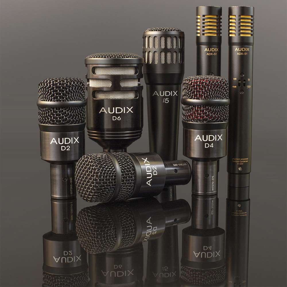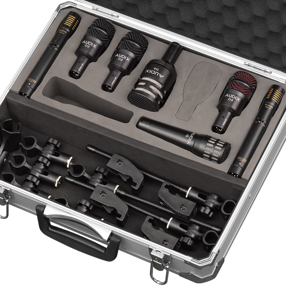 Included in the DP7 drum microphone package is the D6, Audixs flagship kick drum microphone, two D2 dynamic drum microphones for rack toms, one D4 for floor tom, the i5 for snare, and a pair of ADX51 studio condenser microphones for overhead miking. Also included are four D-Vice rim mount clips for the snare and tom microphones, and three heavy-duty tension fit microphone clips for the other three microphones. Everything is conveniently packaged in a foam-lined aluminum road case for safekeeping when the microphones are not in use.
