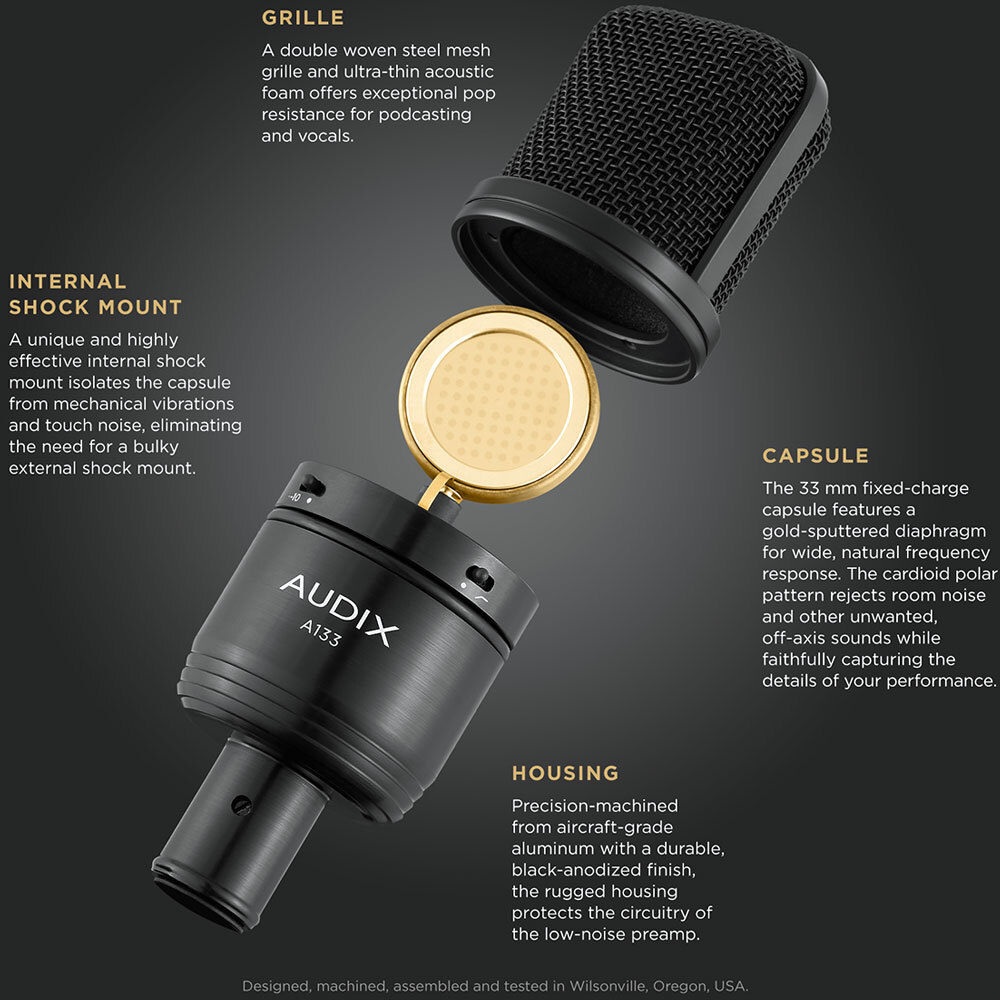 The A133 is a large-diaphragm condenser microphone ideal for vocals, choir, piano, acoustic instruments, and overheads. Featuring a contemporary, compact design, the A133 is the perfect choice for podcasting, professional audio production, studios, and live stage performances.