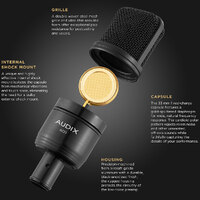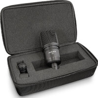 Large diaphragm condenser microphone. Ideal for vocals, choir, piano, acoustic instruments and overheads. Fixed-charge capsule featuring a 30 mm gold-sputtered diaphragm for wide and natural frequency response. Unique internal shock mount. Double woven steel mesh grille and ultra-thin acoustic foam for exceptional pop resistance. Includes carrying case and clip. Requires 48-52 V phantom power. Cardioid. "