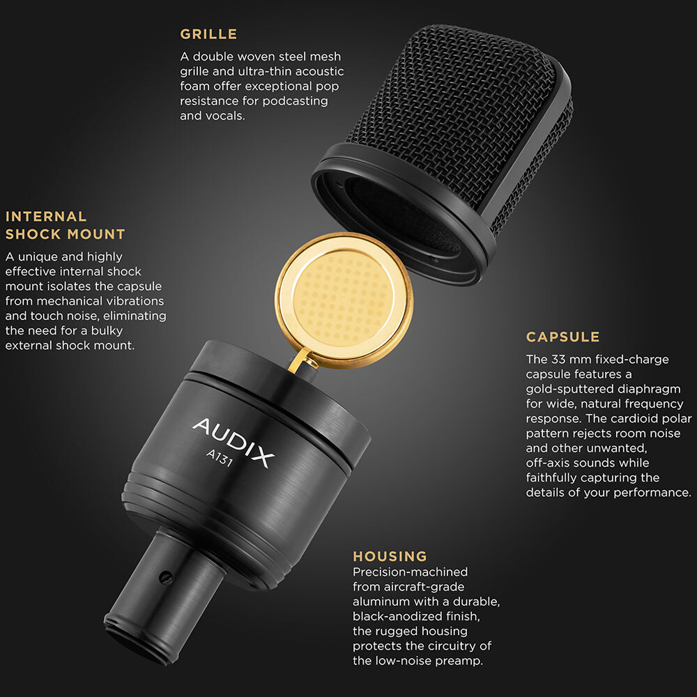The A131 is a large-diaphragm condenser microphone ideal for vocals, choir, piano, acoustic instruments, and overheads. Featuring a contemporary, compact design, the A131 is the perfect choice for podcasting, professional audio production, studios, and live stage performances.
