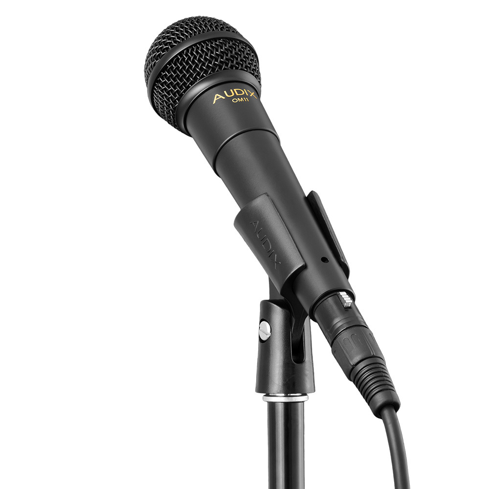 Designed, machined, assembled, and tested by Audix in the USA, the OM11 vocal dynamic microphone was first issued in 1985 as the OM1. This microphone is a dynamic vocal microphone used for a wide variety of stage, studio, and broadcast applications. Its sharp, crisp vocal sound, resistance to feedback, and ability to handle high SPLs without distortion are trademarks of the OM11.