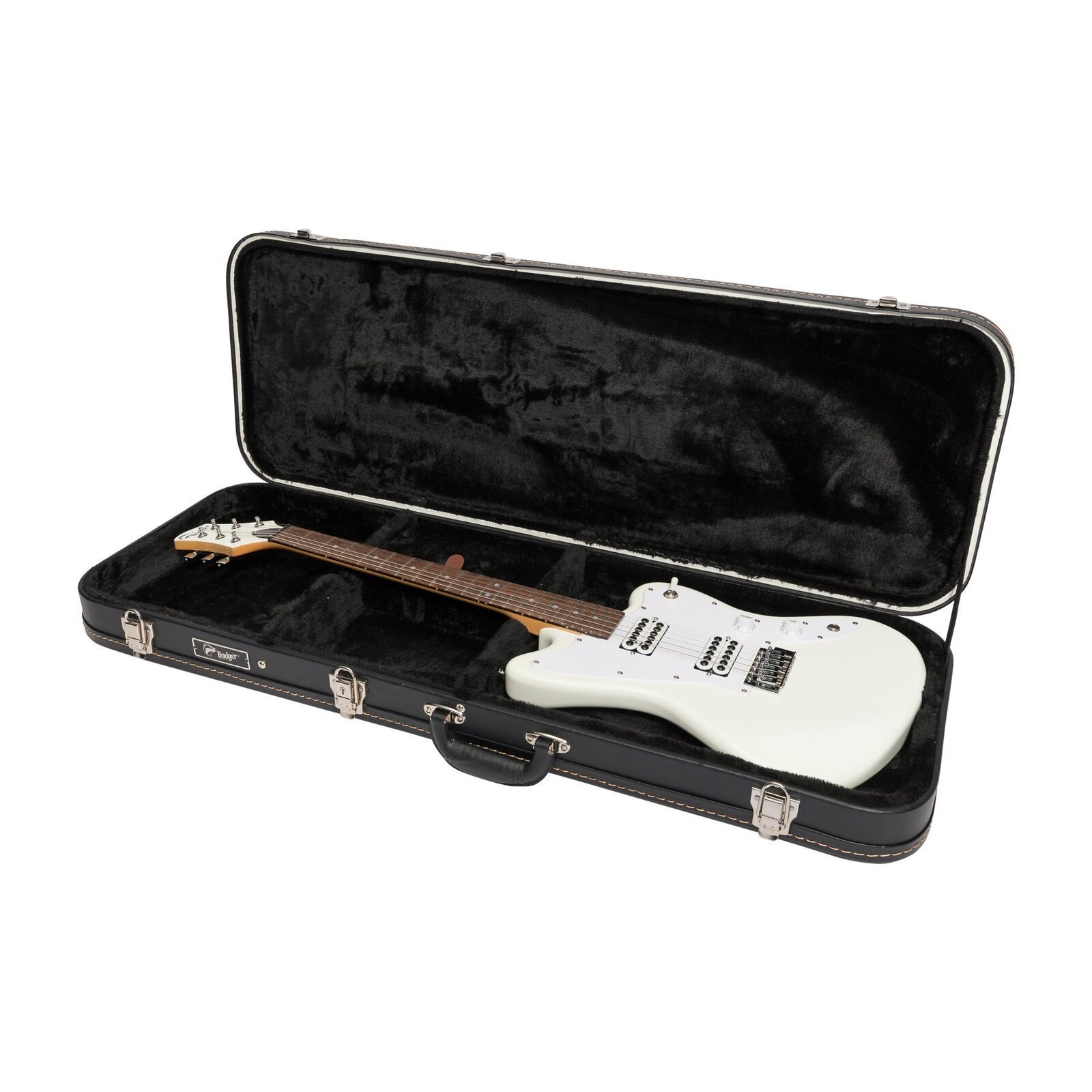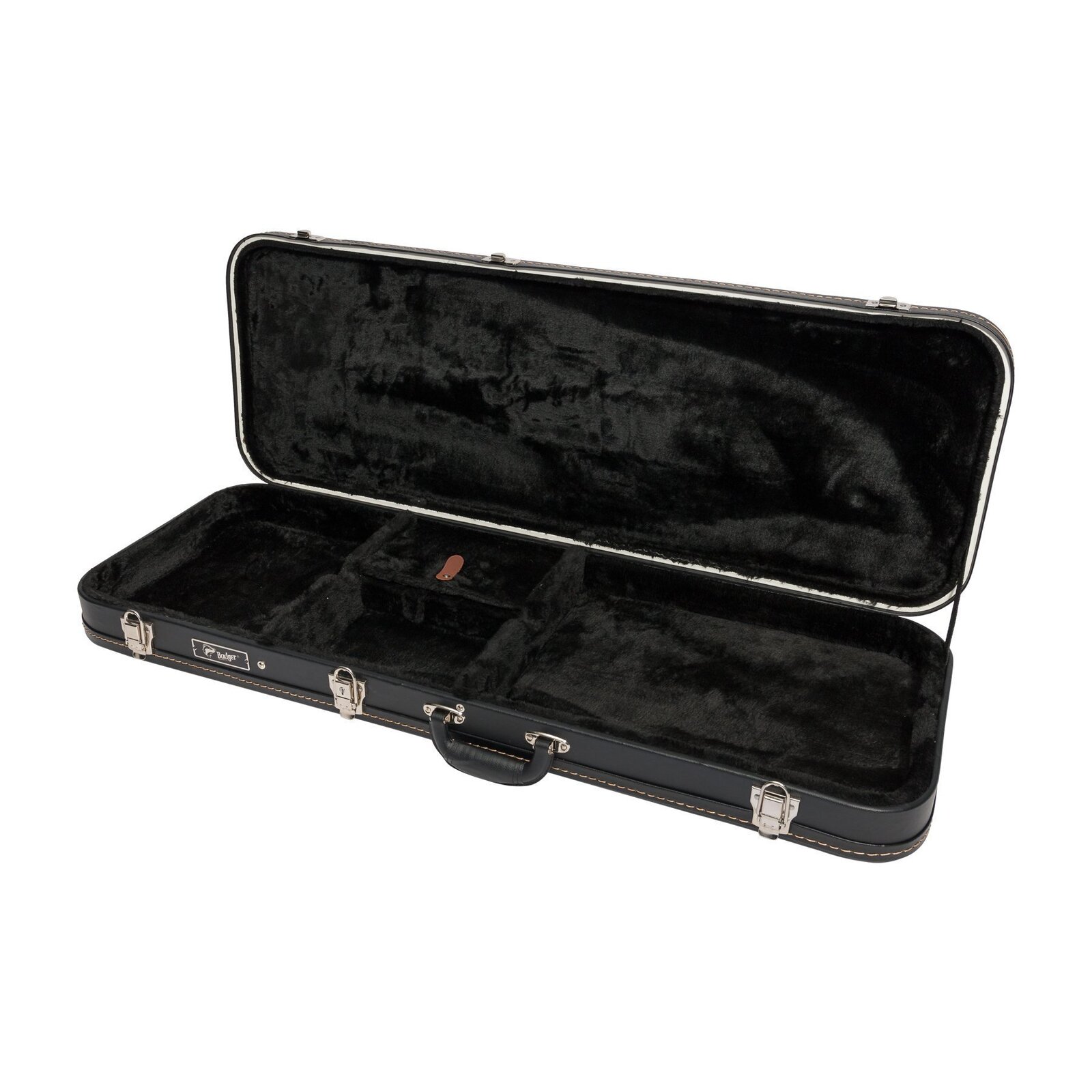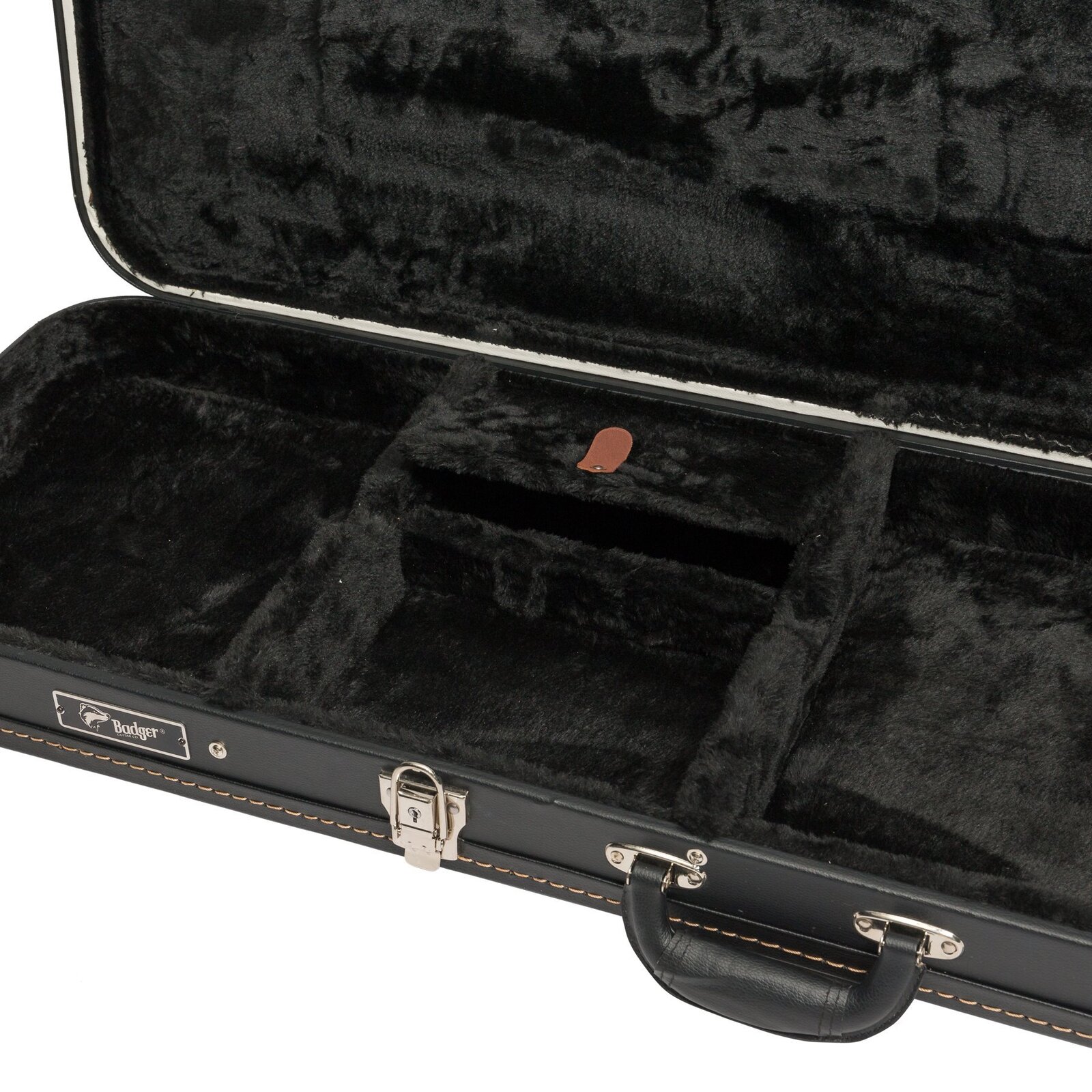 The perfect travel companion for your Badger Classic electric guitar; the Badger electric guitar hard case features traditional plywood construction, deluxe padded carry handle, flip-lock latches (central latch locking), plush black interior, accessories compartment and striking two-tone water resistant vinyl finish.