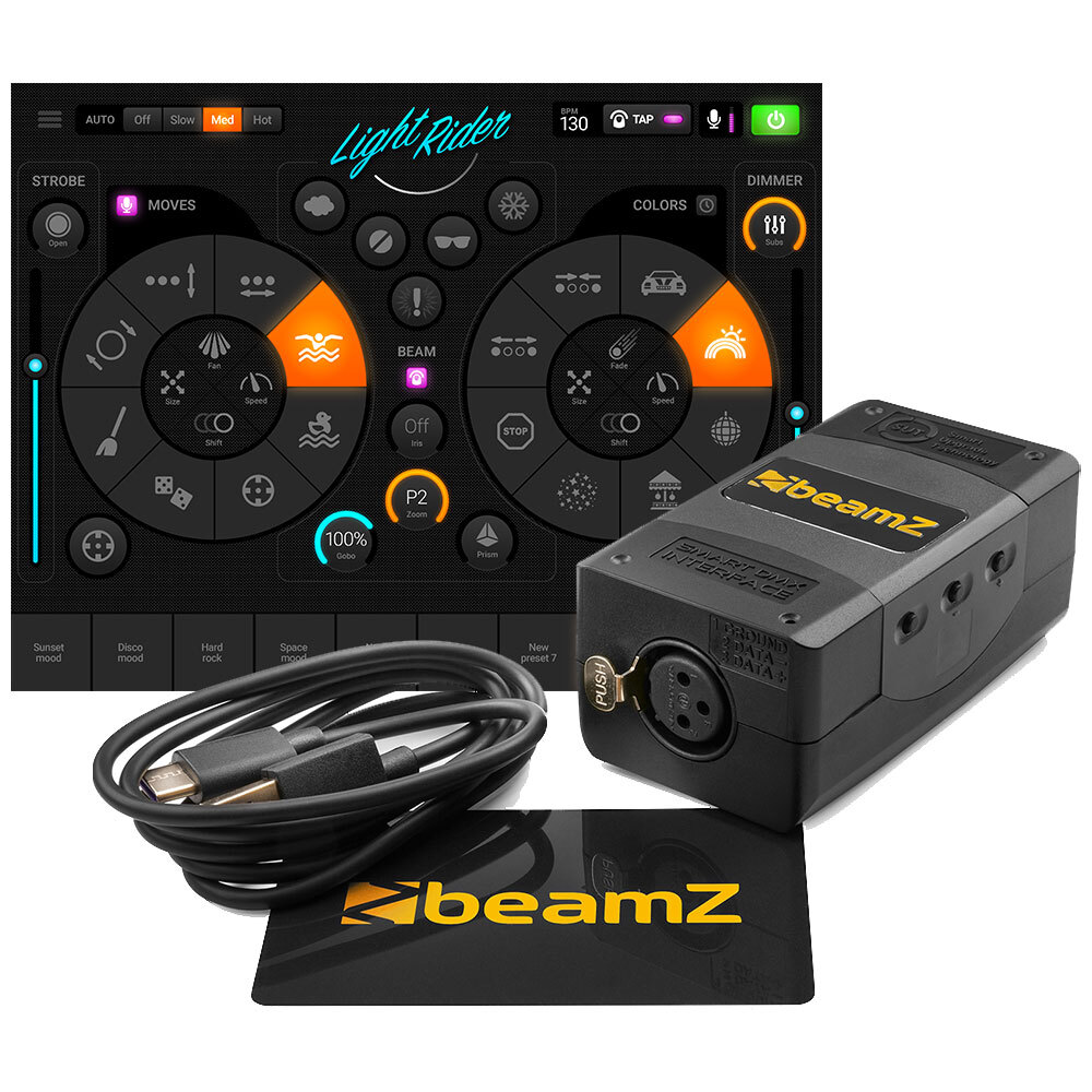 Push your light show to the next level with the new BeamZ DMX interface for PC, Android and iPad! Supplied with both Easy Stand Alone 2 (Beamz version) DMX software and the easy to use DMX app Light Rider for your tablet device. Allowing you to create captivating lighting shows with ease and without needing any prior lighting experience. Choose from over 15,000 lighting fixtures and once added, they will bounce, chase, ride, sparkle and perform a light show like you’ve never seen before. Built on over 25 years of DMX lighting control experience, Light Rider finally puts a great light show into the hands of a working DJ, who might not have the time to spend hours programming scenes before a show. The lighting levels, colours and effects can be programmed from a PC, Mac, Android, iPad or iPhone using the included software. Out of the box the Light Rider USB interface supports 128 DMX channels but can be upgraded to support up to a full DMX universes (512 Channels) for larger lighting shows. To upgrade your license and access more DMX channels visit www.dmxsoft.com