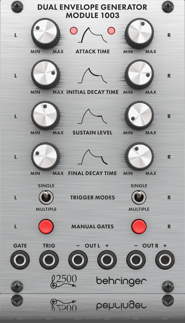 An authentic reproduction of the original “System 2500” circuitry from the 70’s that can fit in a standard Eurorack case. The best part? It’s at a very affordable price. Mix in with your existing rig or start your modular synth journey from here. Either way you’re sure to have a lot of fun. Classic 1003 dual analog ADSR generator module from the '70s Authentic reproduction of the circuitry from the "2500" Series Contains 2 identical envelope generators for creating control signals 4 adjustable parameters: Attack, initial Decay, Sustain, final Decay Each envelope is initiated by Gate and Trigger signals Switchable between 2 operating modes for added flexibility Single trigger mode uses only the gate signal to control the envelope Multi trigger mode uses a positive trigger pulse to re-trigger the envelope while a Gate signal is present Manual gate operation via front panel push button with LED for gate signal indication Eurorack specs: 16 HP, XX mA +12 V, XX mA -12 V