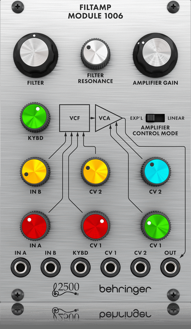 An authentic reproduction of the original “System 2500” circuitry from the 70’s that can fit in a standard Eurorack case. The best part? It’s at a very affordable price. Mix in with your existing rig or start your modular synth journey from here. Either way you’re sure to have a lot of fun. Classic 1006 analog FiltAmp module from the '70s Authentic reproduction of the circuitry from the "2500" Series Consists of a 24 dB transistor ladder low-pass filter followed by a discrete VCA Filter cut-off frequency is controlled by external control voltages and by the Frequency control 3 external VCF control voltage inputs with variable attenuation respond at 1 V/Octave A resonance or "peaked" response at cut-off is adjusted with the Resonance control 2 audio signals can be mixed and their relative amplitude adjusted VCA accepts the output from the VCF and modifies the output signal level according to the sum of the Gain control and external control voltages 2 external VCA control signals can be attenuated by front panel controls VCA mode can be selected as either Exponential or Linear Eurorack specs: 16 HP, XX mA +12 V, XX mA -12 V