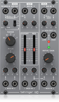 This is the Behringer System 100 110 VCO/VCF/VCA Module. An authentic reproduction of the original “System 100M” circuitry from the 80s that can fit in a standard Eurorack case.