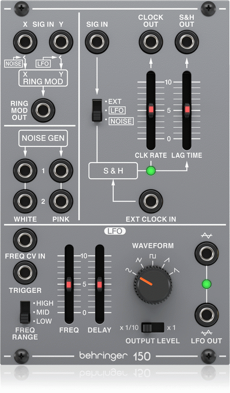 This is the Behringer SYSTEM 100 150 RING MOD/NOISE/S&H/LFO. An authentic reproduction of the original “System 100M” circuitry from the 80’s that can fit in a standard Eurorack case. The best part? It’s at a very affordable price. Mix the 150 RING MOD/NOISE/S&H/LFO in with your existing rig or start your modular synth journey from here. Either way you’re sure to have a lot of fun.