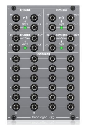 The SYSTEM 100 173 QUAD GATE/MULTIPLES Module includes 4 signal gates (switches) with buffered audio inputs and outputs for immediate signal switching. This enables users the option to pick between a control gate operation, non-inverting (active high) input or an inverting (active low) input.
