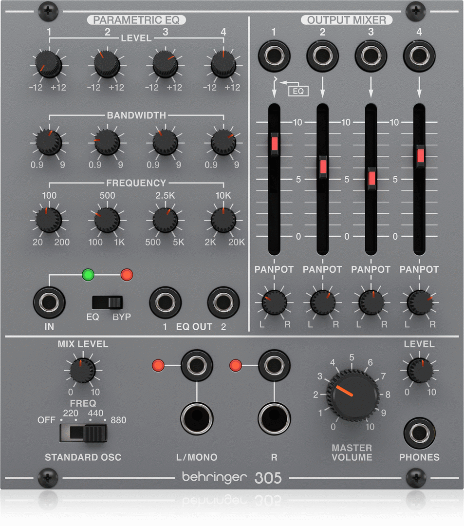This is the Behringer System 100 305 EQ/MIXER/OUTPUT Module. A parametric EQ, mixer/oscillator and headphone amp combo that’s an authentic reproduction of the original “System 100M” circuitry from the 80s that can fit in a standard Eurorack case.