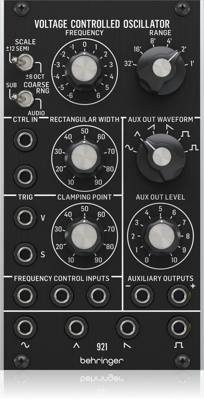 The Behringer 921 VOLTAGE CONTROLLED OSCILLATOR module consists of six applicable waveforms (sine, triangle, saw, inverted saw, square, and inverted square). These can be used through the Frequency and Range controls to switch the tonality of the signal. Finer frequency control is given via the Scale and Coarse RNG switches.