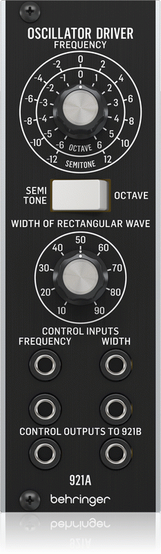 A must have modulation module. The Behringer System 55 921A Oscillator Driver offers two summed CV inputs for frequency control and two summed CV inputs for pulse width modulation. High current outputs allow for frequency and pulse width to drive multiple Behringer 921B and other Eurorack modules. The module also provides a switch for semitone/octave selection plus manual control over pulse width.