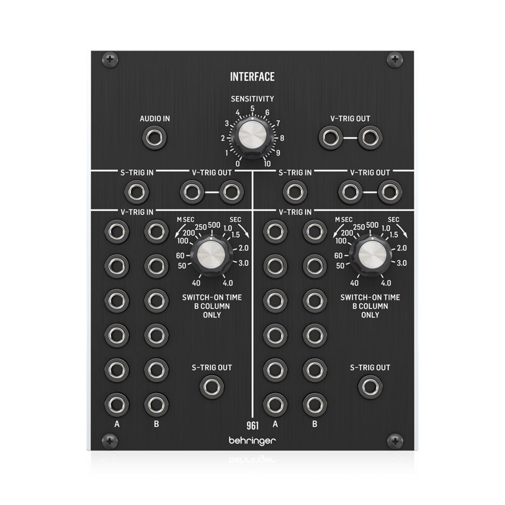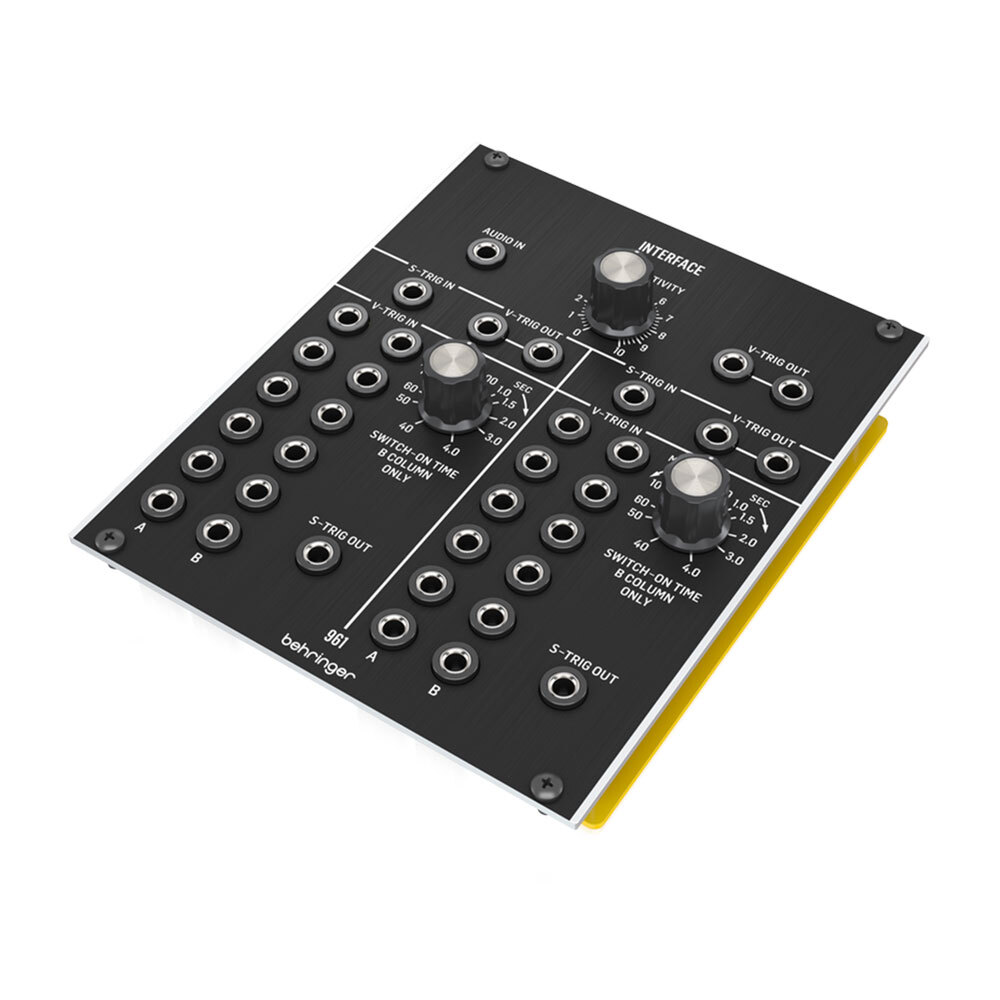 Controls such as the Sensitivity knob allows you to adjust the gain of the Audio In signal. Moreover, the Column B in each V-Trig In bank has its own Switch-On Time knob you can use to manually control how short or long the “ON” duration is for S-Trig signals. Ultimately, add a 960 sequential controller to the mix and unleash the complete creative potential of the 961 Interface.