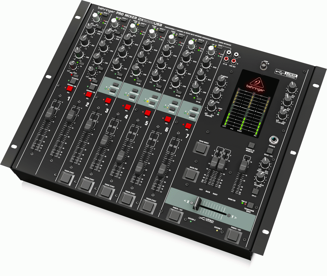 These days, a DJ commands a whole lot more than just a mic and a couple of turntables! On any given gig you may be required to accommodate a multimedia presentation, variety of audio platforms (vinyl, CDs, mp3) and multiple mics. Thats why we proudly present the 7-channel PRO MIXER DX2000USB with its fully-adjustable infinium Contact-Free Crossfader and built-in USB/audio interface. Now the DJ who wears many hats is always ready for anything! The DX2000USB features our super-smooth channel faders and the infinium Contact-Free VCA-controlled optical crossfader for the ultimate in reliability and state-of-the-art audio performance. A dedicated CF Curve control allows you to custom-tailor the crossfaders control characteristic, and you can even set the crossfader tension just the way you like it. The DX2000USB comes armed with a 3-band kill EQ and Gain control per channel. Mono channels feature an additional Low Cut switch and an FX switch that routes the channel to the FX Send and Return loop, so you can add a touch of outboard effects. These channels, which accept microphones and ¼" line sources, also feature a Talkover button, a Channel On button and PFL switch for headphone monitoring. Stereo channels have an EQ on/off switch, as well as a Crossfader button that sends the channel to the main stereo mix or the crossfader. An Assign button selects whether the channel appears on the X or Y side of the Crossfader. For the DJ in need of mammoth bass, the DX2000USB features an XLR Sub Bass Out (perfect for connecting to an active subwoofer) with an adjustable Crossover Frequency (30 - 200 Hz) and dedicated Level control. Directly above, the DX2000USB provides a ¼" Main Mono ouput for synching your musics strongest pulses with a lighting system. The Main Output section offers ¼" and XLR stereo outputs, as well as ¼" inputs for connection to outboard EQ units. This section also features RCA outputs for recording your set. The Monitor/Zone Output section gives you stereo ¼" and XLR Monitor Outputs, as well as ¼" stereo Zone Outputs. Professional, 7-channel, ultra-low noise DJ mixer with state-of-the-art phono preamps 45-mm infinium contact-free optical crossfader with adjustable friction for years of use 5 dual stereo inputs plus 2 mono mic/line channels with ULN mic preamps, Phantom Power, Gain control and Clip LED Built-in USB interface for recording and playback of any digital music file. Works with your PC or Mac* computerno setup or drivers required Massive software bundle including Audacity* vinyl restoration and recording, Podifier* and Golden Ear* podcasting software downloadable at www.behringer.com Ultra-musical 3-band kill EQ (-32 dB) with EQ on/off switch on all stereo channels Long-wearing 100-mm faders and sealed rotary controls on all input channels Headphone output with Level and Balance (PFL/Main) controls, switchable split mode and level display Auto-talkover function with separate Sensitivity, Time and Damping controls Main Dim, main Boost, Punch and Cut functions for awesome mix options Subbass Out for separate subwoofer, additional Zone output for second room/area "Planet Earth" switching power supply for maximum flexibility (100 - 240 V~), noise-free audio, superior transient response plus low power consumption for energy saving Rack mount brackets included for ultimate flexibility Designed and engineered in Germany