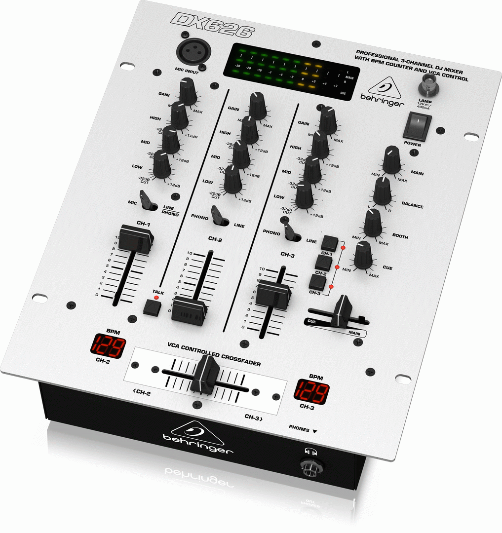 The professional, high quality PRO MIXER DX626 is 3-channel DJ mixer with integrated Beat-Per-Minute (BPM) counter, designed to embody a proven 3-channel design loved by DJs worldwide – beginners and professionals alike. Its super-smooth, dual-rail “Ultraglide” crossfader with up to 500,000 life cycles guarantees years of flawless performance.