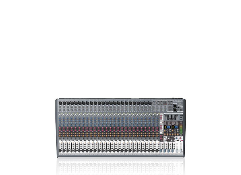 The 32-Input, 4-Bus EURODESK SX3242FX allows you to effortlessly achieve premium-quality sound, thanks to 24 of our studio-grade XENYX Mic Preamps, 2 full stereo channels with 4-band EQ, plus 2 additional sets of stereo inputs channels with Level and Aux controls. All mono channels feature our ultra-musical, 3-band “British” channel EQs, complete with a semi-parametric mid band for the ultimate in sound sculpting. Add to this not one, but two of our 24-bit dual-engine stereo FX processors with 99 awesome presets including reverb, chorus, flanger, delay, pitch shifter and various multi-effects – and the SX3242FX becomes an incredibly versatile mixer for your recording projects and live performances. • Premium ultra-low noise, high-headroom analog mixer • 24 state-of-the-art XENYX Mic Preamps comparable to stand-alone boutique preamps • Neo-classic "British" 3-band EQs with semi-parametric mid band for warm and musical sound • 2 independent studio-grade 24-bit stereo FX processors with 99 awesome presets including reverb, chorus, flanger, delay, pitch shifter and various multi-effects • High-precision 9-band stereo graphic EQ allows precise frequency correction of monitor or main mixes • Revolutionary FBQ Feedback Detection system instantly reveals critical frequencies • Peak LEDs, Mute, Main mix and subgroup routing switches, Solo and PFL functions on all channels • 2 fully featured stereo input channels with 4-band EQ plus 2 additional stereo input channels with Level and pre-fader Aux controls • Inserts on each mono channel and main mix for flexible connection of outboard equipment • 4 Subgroup outputs and additional Mono output with sweepable Low Pass filter for subwoofer application • 4 Aux sends per channel: 2 pre/post fader switchable for monitoring/FX applications, 2 post fader (for internal FX or as external send) • Balanced Main mix outputs with ¼" jack and gold-plated XLR connectors, separate Control room, Headphone and stereo Tape outputs • Solo-In-Place and Pre-Fader-Listen functions plus full-featured Talkback section • Standby switch mutes all channels during breaks while background music is provided via CD/Tape inputs • Long-wearing 60 mm logarithmic-taper faders and sealed rotary controls • Internal autorange power supply for maximum flexibility (100 – 240 V~), noise-free audio, superior transient response plus low power consumption for energy saving • Designed and engineered in Germany
