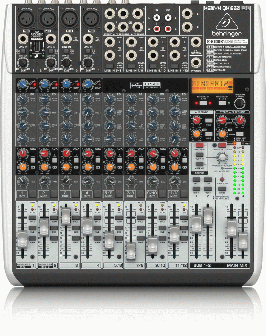 The amazing PMP2000D Powered Mixer packs 2,000 Watts of high-efficiency Class-D output power, while maintaining an incredible power-to-weight ratio. With 14 available input channels, the PMP2000D features 9 of our premium-grade “Invisible” IMP mic preamps with switchable +48 V phantom power, 4 stereo channels, an ultra-high quality KLARK TEKNIK FX processor with 25 presets including studio-class reverbs, delays, pitch shifter and various multi-effects – and dual 9-band stereo graphic EQs. Top it all off with “Wireless-ready” operation, thanks to our high-quality ULM digital wireless microphones (sold separately), and the PMP2000D is the ideal, easy to use, and ready for anything live sound solution! • Ultra-compact 2 x 1000-Watt stereo powered mixer • Revolutionary Class-D amplifier technology: enormous power, incredible sonic performance and super-light weight • 9 “Invisible” IMP mic preamps with switchable +48 V phantom power for condenser microphones • Ultra-high quality KLARK TEKNIK FX processor with 25 presets including reverb, chorus, flanger, delay, pitch shifter and various multi-effects • "Wireless-ready" for high-quality BEHRINGER digital wireless system (not included) • 14-channel mixer section features 6 mono and 4 stereo channels • Effective, extremely musical 3-band EQ, switchable Pad and Clip LEDs on all mono channels • Dual 9-band graphic EQs allow precise frequency correction of monitor and main outputs • Selectable stereo (main L/R), double mono (main/monitor) or bridged mono amplifier operation mode • Adjustable stereo Aux input for connecting external signal sources • Internal switch-mode power supply, noise-free audio, superior transient response and very low power consumption • Designed and engineered in Germany