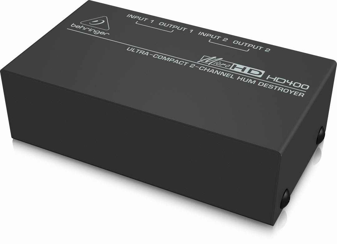 The HD400 is the ultra-affordable way to quickly and easily clean up your act! Whether youre recording or performing, its important to keep AC hum out of the mix. No matter the quality of the venues wiring, the MICROHD HD400 Hum Destroyer eliminates AC hum quickly and reliably. The HD400 features two channels allowing you to eliminate hum in two mono signals or one stereo signal. Placing the HD400 in-line between your stereo mixer and power amps for a squeaky-clean sound free of AC hum. It breaks ground loops safely while maintaining the highest sound quality. It can even convert your unbalanced signals into balanced without any signal degradation. Removes AC hum and noise - fast, easy and reliable Breaks ground loops safely, while keeping highest sonic quality 2 independent channels for 2 mono or 1 stereo signal Automatically converts unbalanced to balanced signals without signal loss Designed and engineered in Germany