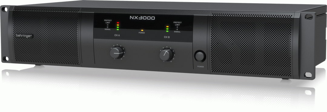 The Behringer NX3000 is the sister to the NX3000D and is a lightweight, cool-running unit that has well above specifications for its price and D CLASS TECHNOLOGY WITH NEAR zERO THERMAL buildup .The Behringer NX3000D Power Amplifier features a two channel design with a built-in DSP section (that can be controlled over USB or directly from the front-panel LCD) boasting a sophisticated delay, crossover, EQ, and much more. The amplifier delivers a maximum output of 3000 watts into 4 ohms (bridged), as well as 2 x 1500 watts into 2 ohms and 2 x 900 watts into 4 ohms. The rear panel of the NX3000 power amp offers two XLR and 1/4'' TRS combo input connectors, along with two professional-quality twist-lock speaker connectors. The detented and illuminated gain controls ensure precise level setting whilst the 4-segment signal and limit LEDs provide at-a-glance monitoring. Complete with extensive overload protection, ''Zero-Attack'' limiters and a rack-mountable chassis, the Behringer NX3000D amp is excellent for installations within live performance venues and commercial environments. . With an efficient switch-mode power supply its able to deliver low noise and great transient response . Its been designed with the ability to resond to its linear frequency response at any speaker load, which is called SmartSense loudspeaker impedance compensation. Combine that with Zero-attack limiters supply maximum output with reliable overload protection for a professional responding power amplifer .
