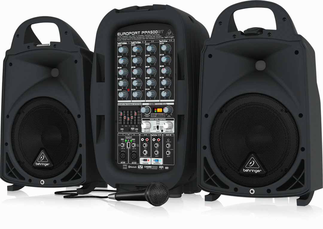 THIS BEHRINGER PA500BT has an integrated "wireless ready" Input for the ULM Series Wireless digital license-free 2.4 GHz frequency spectrum.microphones . THe built in Stereo 500-Watt Powerful package also has built in professional vocal effects from world-famous Klark Teknik – and Behringer’s amazing FBQ Feedback Detection System Couple with with the included a high-quality microphone and cable ,and speaker connections,to power the detachable full sounding loudspeakers . These are high-powered 8" woofers provide punchy low-end and articulate midrange, and the 1.35" aluminium-diaphragm compression drivers offer crystal-clear sonic reproduction.