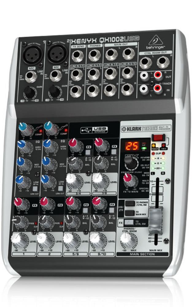 The Behringer XENYX QX1002USB mixer is made to handle live gigs, and provide you with the tools necessary to capture professional-quality recordings. Along with its built-in USB/audio interface, ""one-knob"" mono channel compressors and KLARK TEKNIK FX engines, the XENYX QX1002USB mixer comes with enough recording and editing software to turn your computer into a complete recording studio. The QX1002USB is a 10-input, 2-bus mixer with XENYX mic preamps and compressor, and a range of built-in FX, it's just the right size for medium-sized gigs or home studio applications. RCA CD/Tape I/O comes standard on all XENYX mixers.