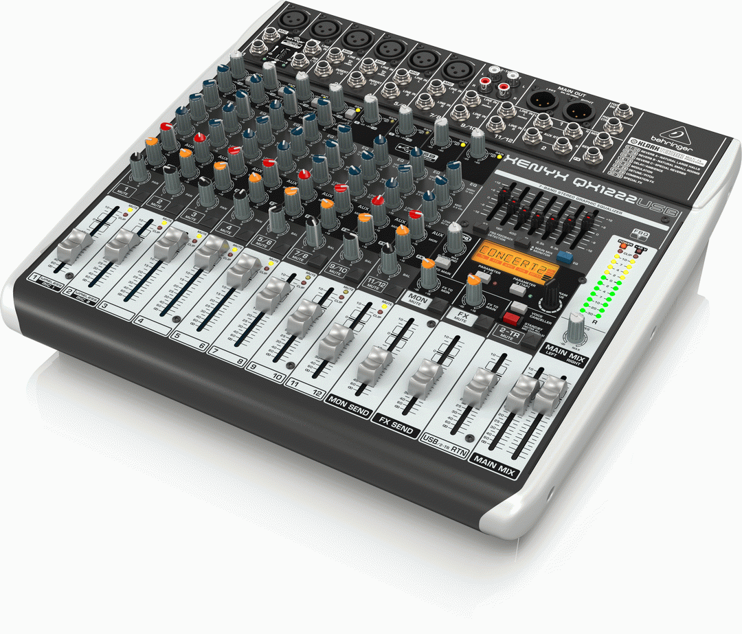 The compact XENYX QX1222USB mixer allows you to effortlessly achieve premium-quality sound. Channels 1 - 4 feature our XENYX Mic Preamps, renowned for their pristine performance, plus 2 of the 4 stereo channels accept XLR inputs, as well as Line-Level sources. All mono channels get our ultra-musical “British” 3-band EQs and easy-to-use “one-knob” compressors for the ultimate in punch and clarity. Add to this our KLARK TEKNIK FX processor with 32 studio-grade presets with dual addressable parameters, Tap function and storable user parameter settings – and the QX1222USB becomes an incredibly versatile mixer for your live performances. But the XENYX QX1222USB isn’t just designed to handle your live gigs; they also provide the state-of-the-art tools you need to make stunning, professional-quality recordings. Along with their built-in USB/audio interfaces, the XENYX QX1222USB comes with all the recording and editing software needed to turn your computer system into a complete, high-performance home recording studio. • Premium ultra-low noise, high headroom mixer • 4 state-of-the-art, phantom-powered XENYX Mic Preamps comparable to stand-alone boutique preamps • 4 studio-grade compressors with super-easy "one-knob" functionality and control LED for professional vocal and instrumental sound • Ultra-high quality KLARK TEKNIK FX processor with LCD display, dual-parameters, Tap function and storable user parameter settings • "Wireless-ready" for high-quality BEHRINGER digital wireless system (not included) • Built-in stereo USB/Audio Interface to connect directly to your computer. Free audio recording, editing and podcasting software plus 150 instrument/effect plug-ins downloadable at behringer.com • Neo-classic "British" 3-band EQs for warm and musical sound • 7-band stereo graphic EQ allows precise frequency correction of monitor or main mixes • Revolutionary FBQ Feedback Detection System instantly reveals critical frequencies • Breathtaking XPQ 3D stereo surround effect for more vitality and enhanced stereo image • Voice Canceller function for easy-to-use sing-along applications • 4 fully equipped stereo input channels featuring 2 additional mic inputs on channels 5/6 and 7/8, 3-band EQ and input trim control • Channel inserts on each mono channel for flexible connection of outboard equipment • 2 aux sends per channel: 1 pre fader for monitoring, 1 post fader (for internal FX and/or as external send); 2 multi-functional stereo aux returns • Balanced main mix outputs with gold-plated XLR connectors, headphone/control room output and stereo rec outputs • Long-wearing 60-mm logarithmic-taper faders and sealed rotary controls • "Planet Earth" switching power supply for maximum flexibility (100 - 240 V~), noise-free audio, superior transient response plus low power consumption for energy saving • Designed and engineered in Germany