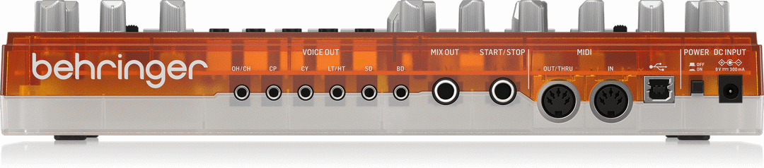 The RD-6-TG has 11 knobs and 26 buttons, all laid out in a highly-intuitive format that puts the fun back into your beat creation. Input and output connections include: Open or Closed Hi-Hat, Clap, Cymbal, Low and Hi Tom, Snare and Bass Drum Voice Outs; Start/Stop for connecting a foot pedal; MIDI In, Out and Thru over USB for connecting the RD-6-TG to a DAW and 5 pin MIDI ports.