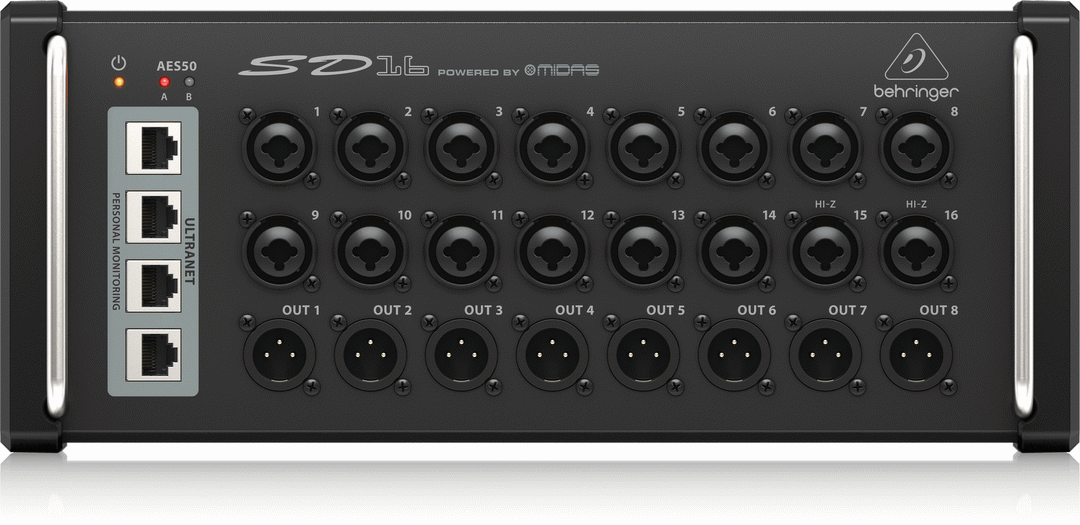 Digital mixing has revolutionized virtually everything in the live- entertainment production workflow. Now weve come up with the perfect solution for connecting the onstage talent with your Front of House (FOH) console, and the rest of the world the ultra-cool and ultra- affordable SD16 Stage Box! The SD16 provides 16 MIDAS-designed remote- controllable mic preamps, 8 balanced analog XLR returns at the stage end, plus an integrated 4-port ULTRANET distribution hub for direct connection to our P16-M personal monitor mixers without any additional hardware required. Plus, the SD16 is extremely compact and comes with rugged protective bumpers, so you can toss them directly on stage wherever you need them. The best part all it takes is a single shielded CAT5e cable per stage box (up to 330 ft / 100 m length). And If you need more inputs, or just want to keep your cable runs short and tidy, putting an SD16 at stage front and another behind the drum riser gives you an additional 16 inputs for drum and guitar/bass amp micing. When used as part of a complete X32 system, as many as three SD16 Stage Boxes can be cascaded via the built-in AES50 ports to provide up to 48 bidirectional inputs and 24 balanced XLR outputs. An onboard ULTRANET distribution hub provides power and 16 channels of audio to 4 BEHRINGER POWERPLAY P16-M personal monitor mixers per SD16, all via inexpensive shielded CAT5e cabling and without any additional hardware. Two of the programmable inputs are also compatible with Hi-Z sources, so you can connect keyboards, acoustic and bass guitars, etc., with no DI box required. The SD16 also features a USB port for fast and easy system updates via your PC. 16 MIDAS-designed, fully programmable mic preamps for audiophile sound quality 8 analog, servo-balanced XLR outputs AES50 network ports featuring KLARK TEKNIKs SuperMAC networking capability for ultra-low jitter and latency 4-port ULTRANET distribution hub for powered connection of 4 BEHRINGER P16-M personal monitoring mixers Digital audio and control connectivity for TURBOSOUND speaker systems with ULTRANET networking capability Rack ears and protection bumpers included for installed and mobile applications Dual AES50 ports for cascading multiple unitsno merger or router required Remote operation via shielded CAT5e cable up to 330 ft / 100 m length USB connector for system updates via PC Ultra-compact and roadworthy, all-steel chassis Designed and engineered in Germany
