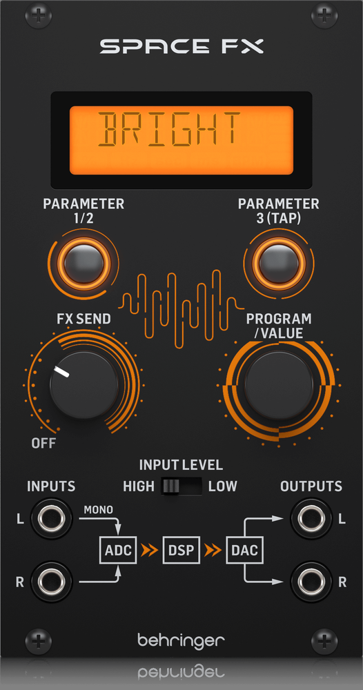 The 80s was the golden age of electronic music. Synthesizers were at their prime and almost every hit song and movie soundtrack at that time had a synth in one form or another. Modular synths have become more and more popular with professionals and enthusiasts over the years and they’re about to get even better. The Behringer SPACE FX is a 24-bit stereo multi-effects module powered by Klark Teknik featuring 32 reverb, delay, modulation, filters and distortion in a compact, rack-mountable synth module. Whether you’re looking to expand your current synth setup or have just started down the rabbit hole, the SPACE FX is a great choice! It comes loaded with 15 reverb effects like room, hall, plate and spring, 8 different delay and modulation effects such as echo, chorus, flanger, phaser and tremolo plus combination effects like delay + reverb and chorus + reverb.