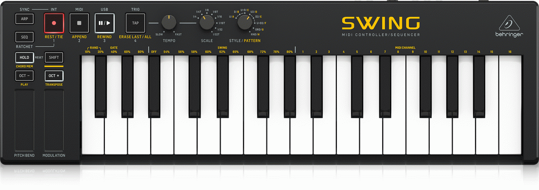 The Behringer SWING gives you full control over any synthesizer or virtual instrument in your DAW via USB or MIDI. Featuring a 64-step sequencer with an 8-note polyphonic sequence combined with 32 compact-sized keys and pitch and modulation touch-strips provide unlimited ways to express yourself in a compact and portable package.
