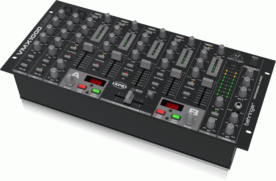 The 7-channel VMX1000USB DJ Mixer is designed to connect directly to your computer and take your music straight into the digital realm. In an instant, the VMX1000USB allows you to record and play any digital music file from your PC or Mac* computer with no setup drivers required! Dual intelligent, built-in BPM (Beats per Minute) counters with Sync Lock and Beat Assist help keep your tracks in sync plus our VCA-controlled faders and crossfader ensure flawless performance. The VMX1000USB also features our proprietary XPQ 3D Surround effect, which allows you to expand the stereo image to create an awesome experience for your audience. Weve also included a free download for a massive software bundle that will transform your computer into a full-fledged music production and editing studio! Professional 7-channel ultra-low noise DJ mixer with state-of-the-art phono preamps Built-in USB interface for recording and playback of any digital music file. Works with your PC or Mac* computerno setup or drivers required Massive software bundle including Audacity* vinyl restoration and recording, Podifier* and Golden Ear* podcasting software downloadable at www.behringer.com Intelligent, dual BPM counter Super-smooth, long-life ULTRAGLIDE faders (up to 500,000 cycles) VCA-controlled crossfader for utmost reliability and smooth audio performance Adjustable crossfader curve for all mixing styles Awesome XPQ stereo surround effect 3-band kill EQ (-32 dB) with EQ on/off switch on stereo channels, Gain control and precise level meter per channel Monitor function with PFL/main balance control and Split option Automatic talkover function with separate Depth and Sensitivity control Balanced Main and additional zone outputs Subwoofer output with adjustable x-over frequency and level control for separate bass amplification Gold-plated RCA connectors for highest signal integrity Designed and engineered in Germany