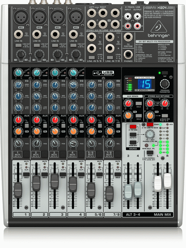 The compact X1204USB mixer allows you to effortlessly achieve premium-quality sound, thanks to 4 onboard studio-grade XENYX Mic Preamps and ultra-musical British channel EQs. And our easy-to-use one-knob compressors provide total dynamic control for the ultimate in punch and clarity, while respecting all the power and emotion you pack into every note. Add to this our 24-bit, dual engine Multi-FX processor with 16 editable, professional-grade presets including reverb, chorus, flanger, delay, pitch shifter and multi-effects and the X1204USB becomes an incredibly versatile mixer for your live performances. But the X1204USB wasnt just designed to handle your live gigs; it also provides the state-of-the-art tools you need to make stunning, professional-quality recordings. Along with a built-in USB/audio interface, the XENYX X1204USB comes with all the recording and editing software needed to turn your computer into a complete, high-performance home recording studio. Premium ultra-low noise, high headroom analog mixer 4 state-of-the-art, phantom-powered XENYX Mic Preamps comparable to stand-alone boutique preamps 4 studio-grade compressors with super-easy "one-knob" functionality and control LED for professional vocal and instrumental sound Neo-classic "British" 3-band EQs for warm and musical sound New studio-grade FX processor with 16 editable presets including reverb, chorus, flanger, delay, pitch shifter, multi-effects, Tap function and storable user parameter settings Built-in stereo USB/Audio Interface to connect directly to your computer. Free audio recording, editing and podcasting software plus 150 instrument/effect plug-ins and ultra-low latency driver downloadable at www.behringer.com 2 aux sends per channel: 1 pre/post fader switchable for monitoring/FX applications, 1 post fader (for internal FX or as external send) Clip LEDs, mute/alt 3-4, solo and PFL functions on all channels 2 subgroups with separate outputs for added routing flexibility 2 multi-functional stereo aux returns with flexible routing Balanced main mix outputs with gold-plated XLR connectors plus separate control room, headphones and 2-track outputs Control room/phones outputs with multi-input source matrix Long-wearing 60-mm logarithmic-taper faders and sealed rotary controls "Planet Earth" switching power supply for maximum flexibility (100 - 240 V~), noise-free audio, superior transient response plus low power consumption for energy saving Rack mount brackets included for ultimate flexibility Designed and engineered in Germany