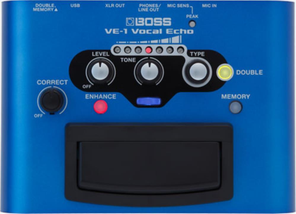 With the Boss VE-1, there’s no need to worry about complicated parameter settings to achieve rich results. Simply dial up a sound from one of the seven available professionally designed presets, and then twist the knobs to easily and intuitively control the effect level and depth. And if you’re a more advanced user, additional detailed parameters are available to fine-tune sounds even further. Along with the top-quality reverbs, dedicated controls are right at your fingertips for applying Double, Pitch Correct, and Enhance features to your vocals to put the finishing touch to your sound. Pitch Correct helps you to stay in tune, and also allows you to obtain that characteristic “electronic voice” sound. With the convenient Memory feature, you can store and recall up to four favorite settings, including your current live setting. The built-in USB audio port enables you to record your polished vocal sound directly to a DAW or create a studio-quality sound for a YouTube performance. The VE-1 runs on batteries or AC power, and works great in any situation, from street performing to recording in your home studio to performing live at a café or club.