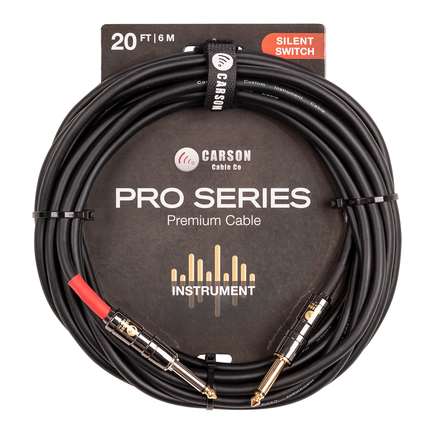 Carson Cable Co.'s SILENT SWITCH PRO. Featuring a Silent Switch connector, this 20-foot instrument cable is of professional quality and outstanding performance. cable with extremely low capacitance and resistance. 150 strand OFC core, 7mm O/D. Heavy-duty, straight-to-silent switch connectors made of black chrome with gold shafts.