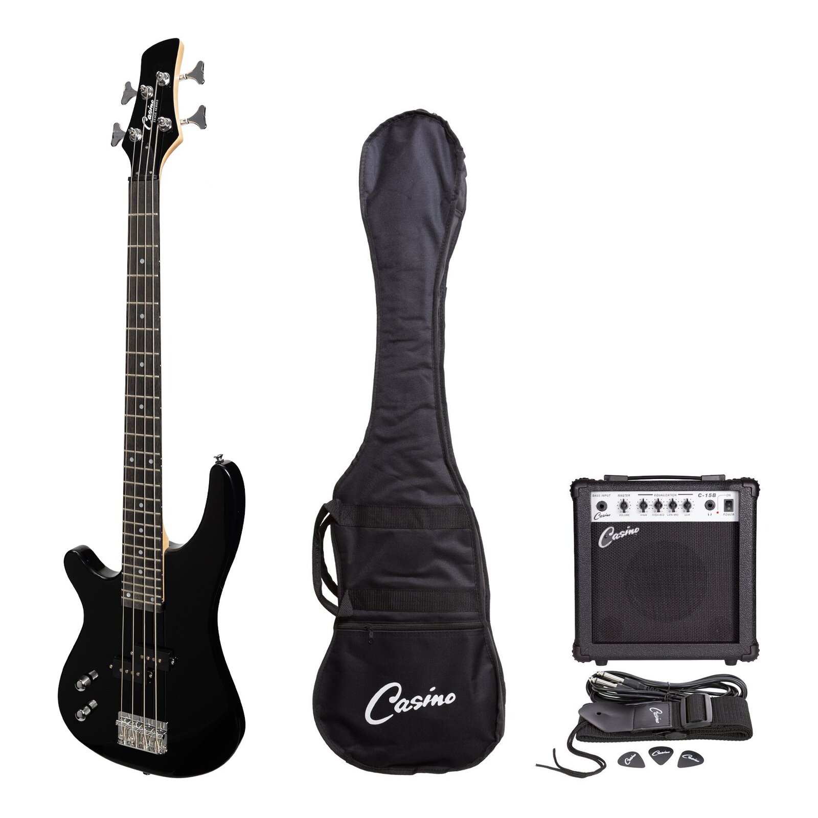 Casino '24 Series' Left Handed Short Scale Tune-Style Electric Bass Guitar and 15 Watt Amplifier Pack (Black)
