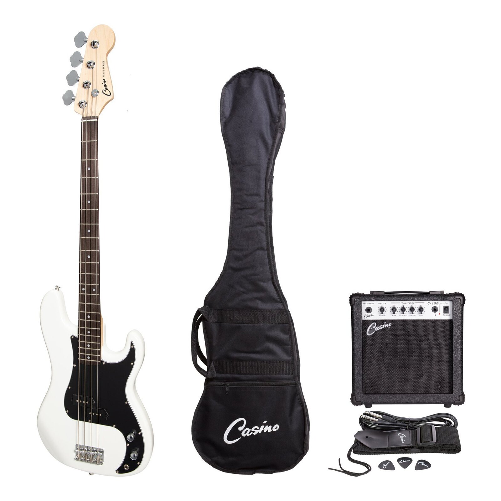Casino P-Style Electric Bass Guitar and 15 Watt Amplifier Pack (White)