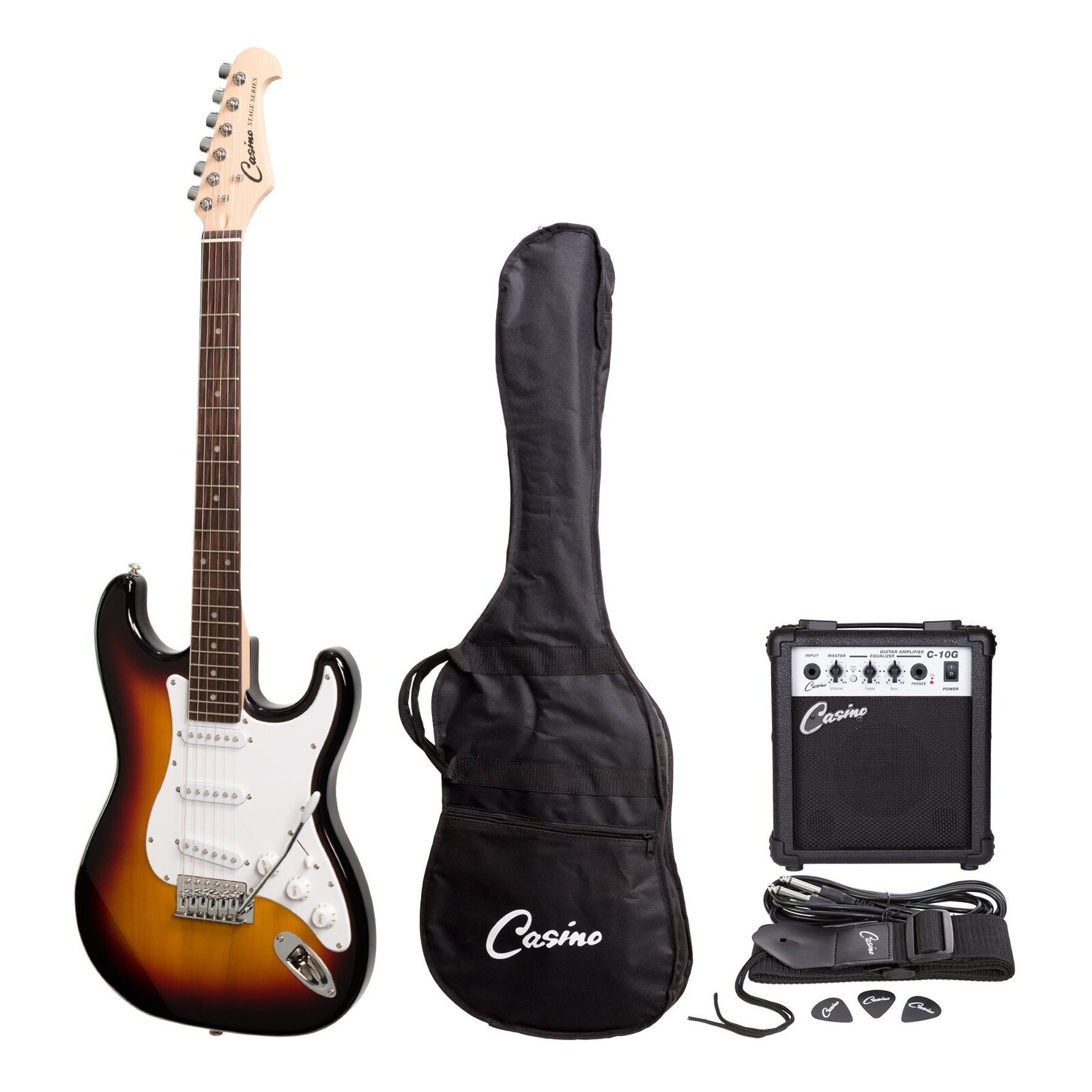 Casino guitar and 10 watt amplifier packs come standard with Casino 10 watt practice amplifier, gig bag, tuner, strap, lead and picks, to ensure you're playing straight away.