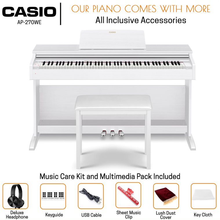 Casio AP-270WE Celviano Digital Piano White w/ Bench and Bonus Bundle