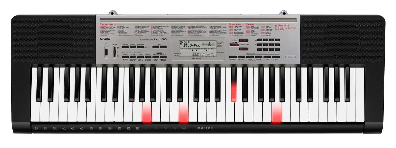 With 400 high-quality Tones and 150 fun Rhythms, the LK-190 delivers a huge variety of musical exploration. You can listen via the built-in speakers, or connect headphones for quiet playing. The LK-190 uses Casio's Key Lighting System, which illuminates keys to indicate which notes to play. Combined with its intuitive Step-Up Lessons, the lighted keys makes it easy to learn the 60 built-in songs.
