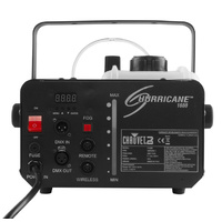 The Hurricane 1600 is a compact, lightweight high output fog machine that with DMX control to enhance any light show. Variable output control from DMX or the included timer remote allows for precise effect operation.The Hurricane 1600 features Always Ready technology providing fog on demand. A manual fog button provides easy control at your finger tips and the LED-illuminated tank enhances operation and safety. An advanced fluid sensor, with automatic shut-off protects the pump from overheating. The machine has ultra-fast heat up time for a quick setup and residue-free water based fog output.- Compact, lightweight, high output fog machine with DMX control