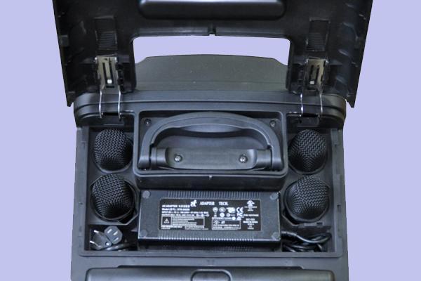 - Storage compartment for 4 transmitters (handheld x 4 pcs or handheld x 2 pcs + beltpack x 2pcs) and a switching power supply.