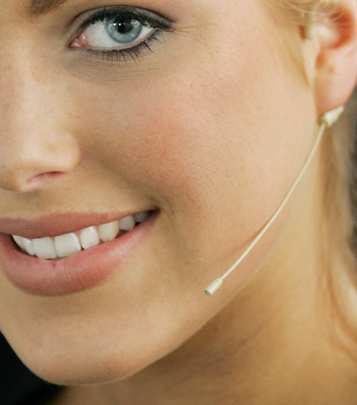 - Slimline beige wireless headset microphone or a lapel for themselves, with bodypack transmitter
