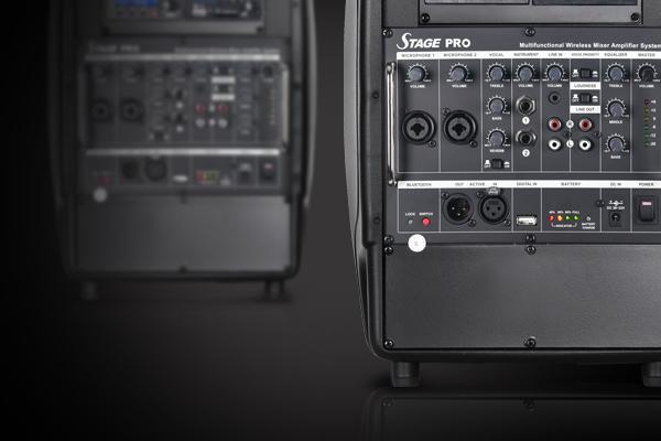 STAGE PRO provides four module slots for installing receiver, transmitting and MP3 recorder player modules. It can playback music by pairing the smartphone with the integrated Bluetooth receiver. Audio inputs include 3.5Ø, RCA and two 6.3Ø instrument jacks with independently adjustable volume. Audio outputs to an external amplifier or recorder via the 6.3Ø or RCA jacks, or to an external active speaker via the XLR jack. Its versatile and considerate design successfully combines sound and functionality.