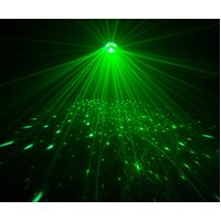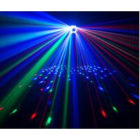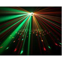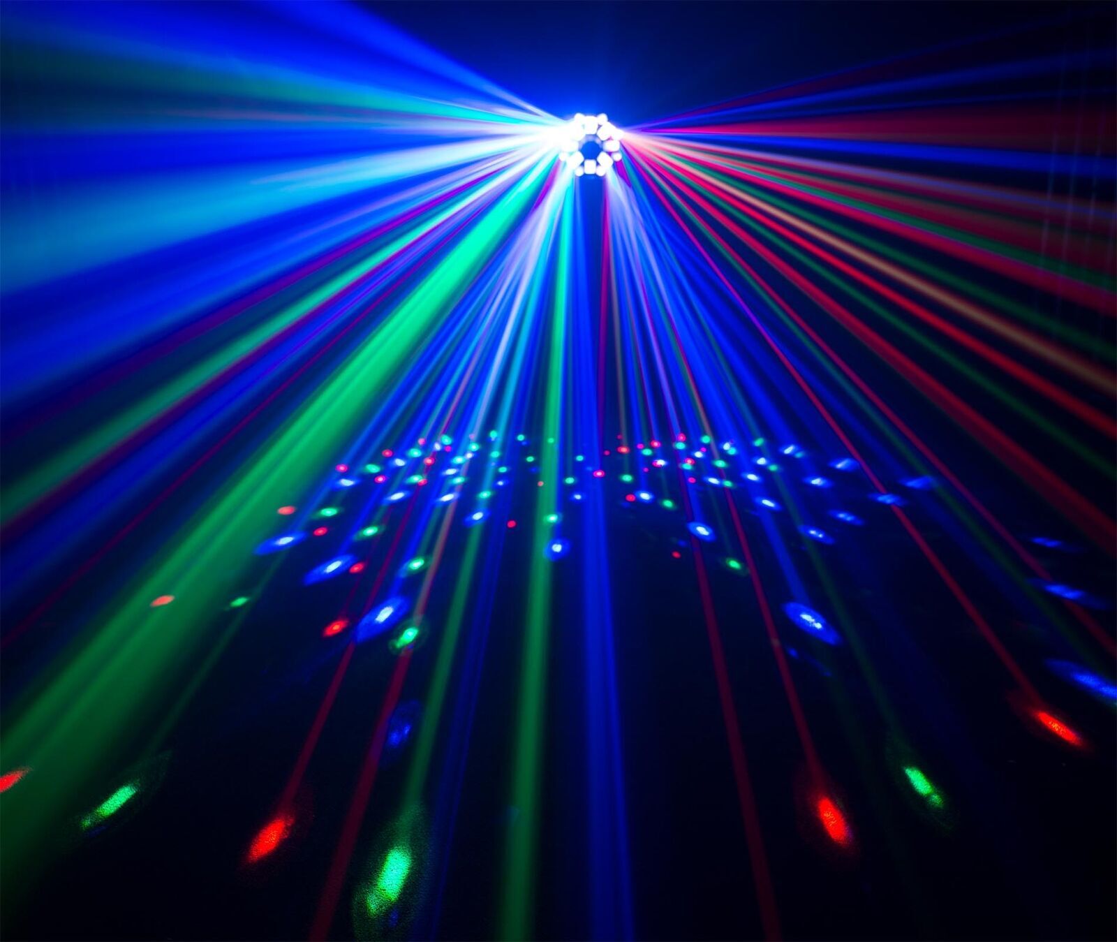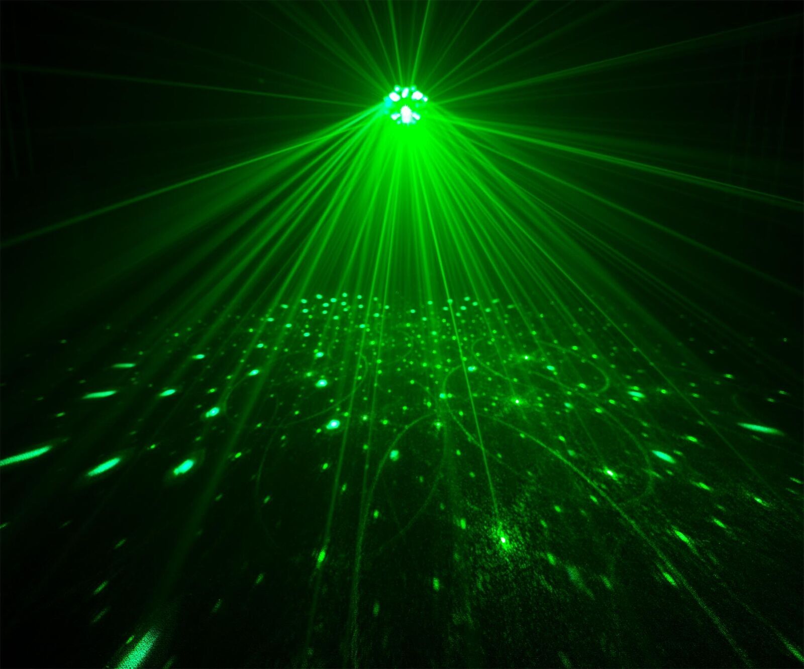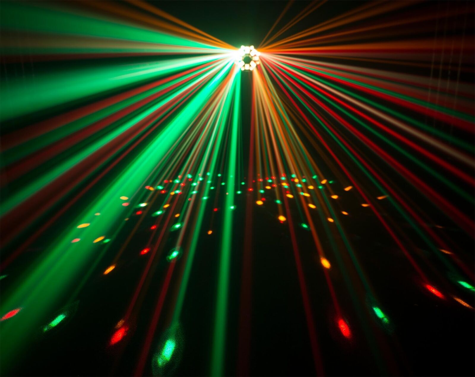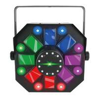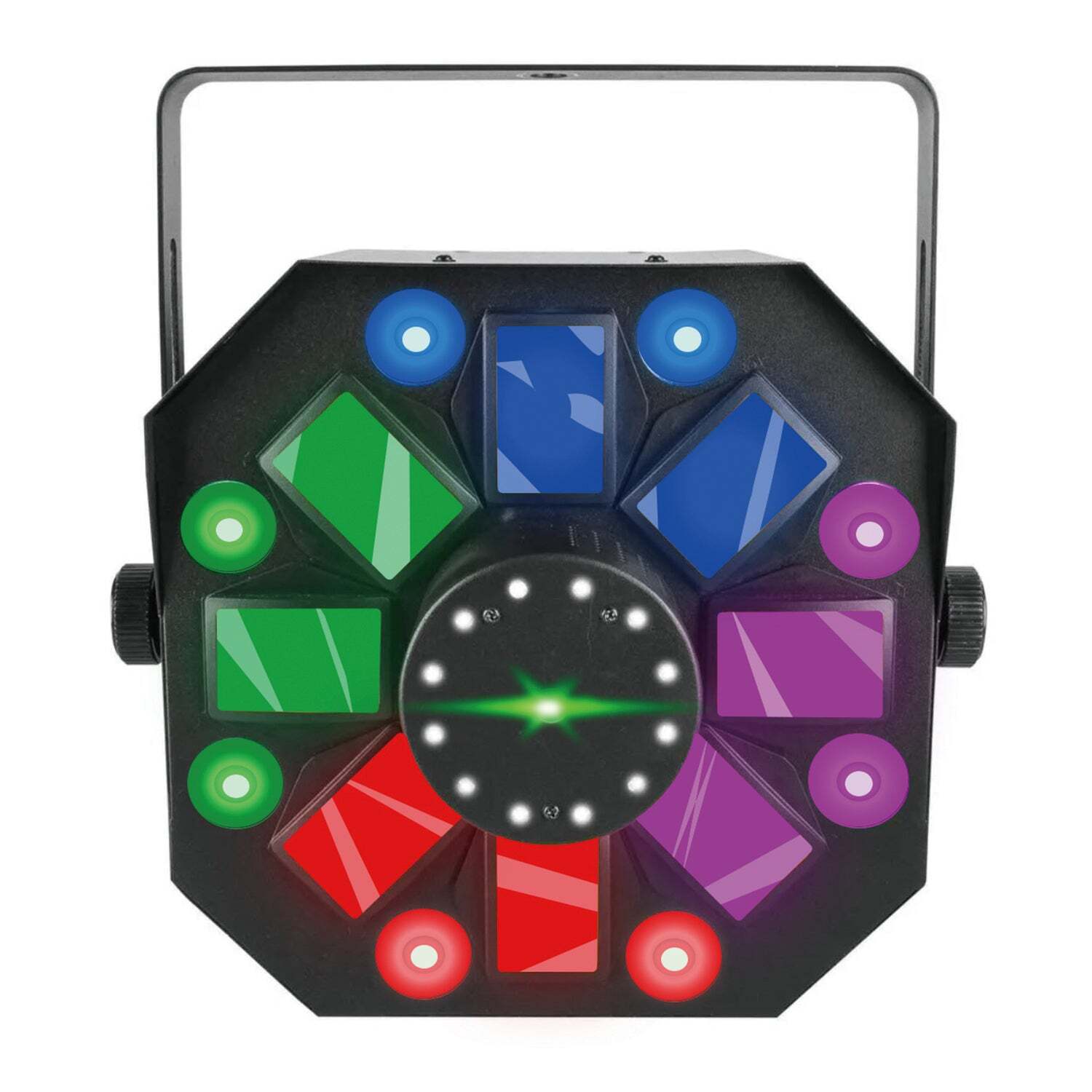 - 4 in 1 LED light that combines an RGBAW rotating derby, RGB+UV wash, red/green laser, and a ring of white SMD strobes